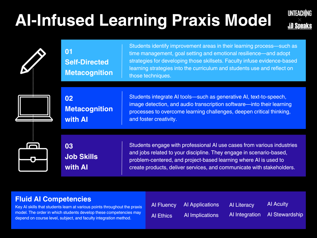 A third dimension that hasn’t been discussed nearly as much is AI in student learning. I’m not talking about using generative AI to outline a paper; that’s AI in assignment completion. I’m talking about evidence-based metacognitive strategies that lead to critical thinking. Popular strategies include previewing, inquiry-based reading, mind mapping, concept mapping, reflective journaling, interleaving, brain breaks, chunking (for studying), retrieval practice, idea generation, and peer teaching.